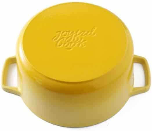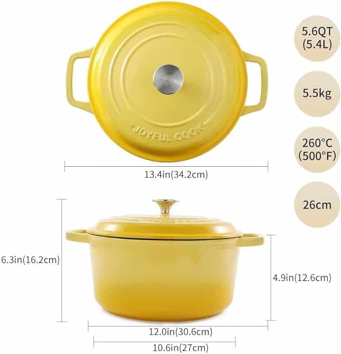 Joyful Cook enameled cast iron round dutch oven with Lid is designed by Joyful Cook for you to enjoy a warm hearty meal cooked to perfection. This Joyful Cook 5.7 Qt is excellent for oven heat distribution and heat retention which makes your food to come out just perfect all the time. With a 5.7 Qt capacity, you can make plenty of food for your family and friends in style. The enameled interior makes the clean up a breeze. This beautiful signature Joyful Cook dutch oven is compatible with all stove top types including gas, electric, ceramic, radiant ring, oven and induction. This enameled dutch oven is oven safe up to 500*F making this duch oven versatile for any cooking method of your choice.